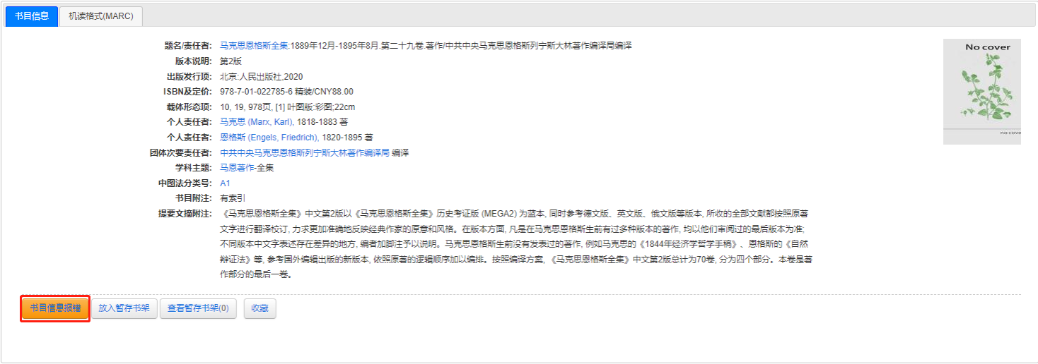 读者身份认证后,可直接点击“书目信息报错”反馈书目数据相关问题,所有反馈将在1-3个工作日内完成,欢迎师生在线使用与交流。