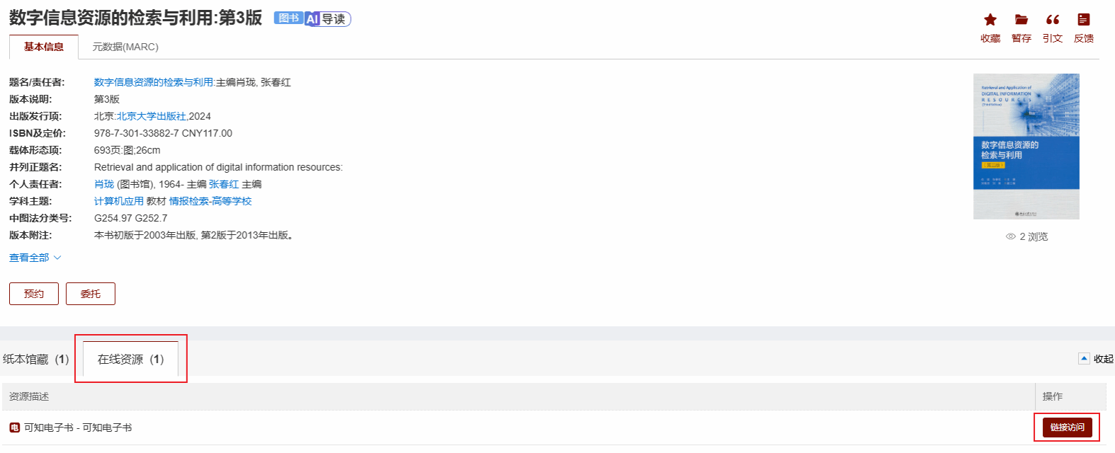 单本图书如果有对应的电子版,会在图书详情页面的在线资源中显示电子图书链接,无论您想阅读纸质图书,还是在线查看电子图书,都能轻松实现。