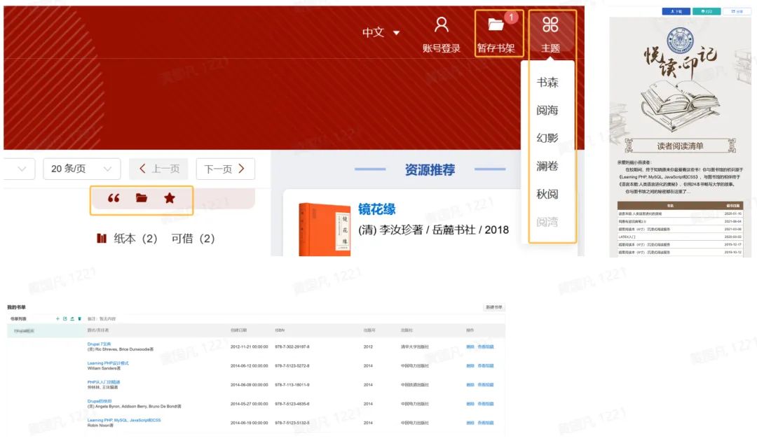旧平台的“书签”功能也已整合到“我的书单”中。新平台还新增了主题模板选择功能,您可以根据不同场景和喜好挑选自己心仪的主题风格。另外在“我的图书馆”中点击右侧“阅读清单”,您也可浏览、下载和分享个人借阅数据,无论是晒出年度阅读成就,还是整理学术阅读记录,都能轻松搞定。
