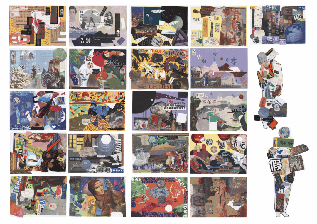 创作分人物塑造、场景构建、交换共创、合作完善四步,完成专属 A4 拼贴作品。
