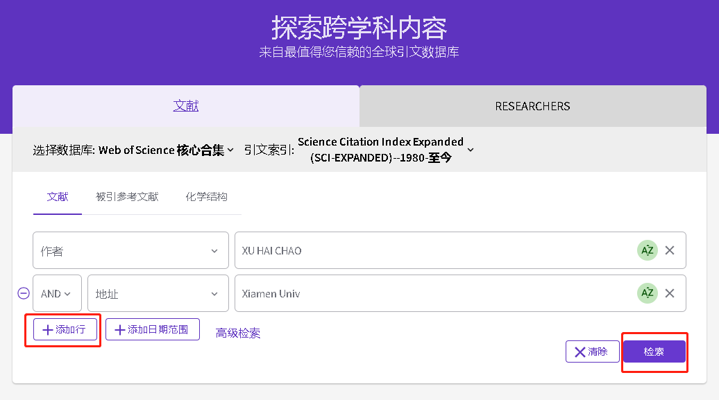 步骤3:选择检索范围,写入检索词。例如选择检索范围“作者”写入作者姓名,同时在另一个检索栏中选择“地址”写入地址名称,最后点击“检索”按钮。(检索栏目可通过点击“添加行”添加)