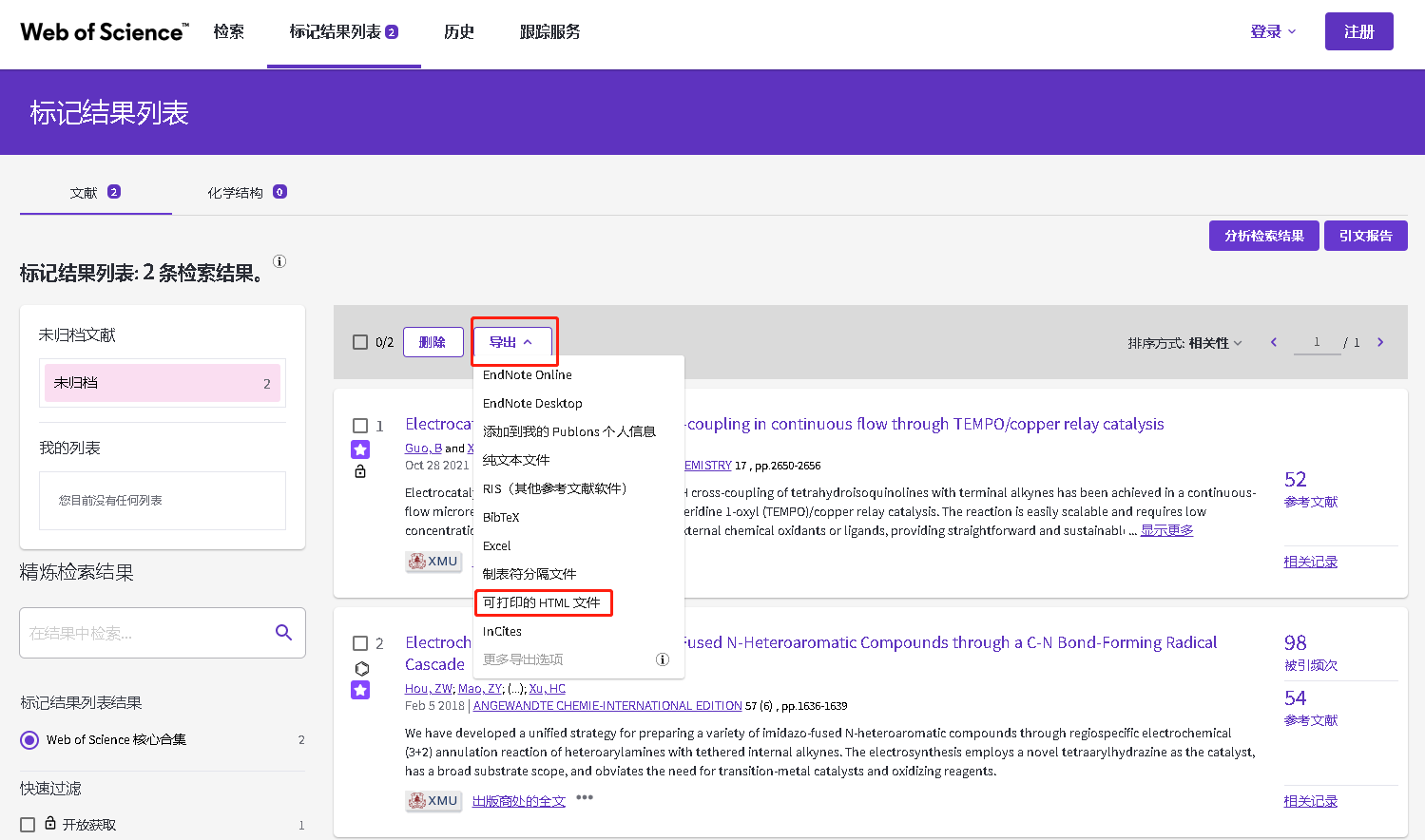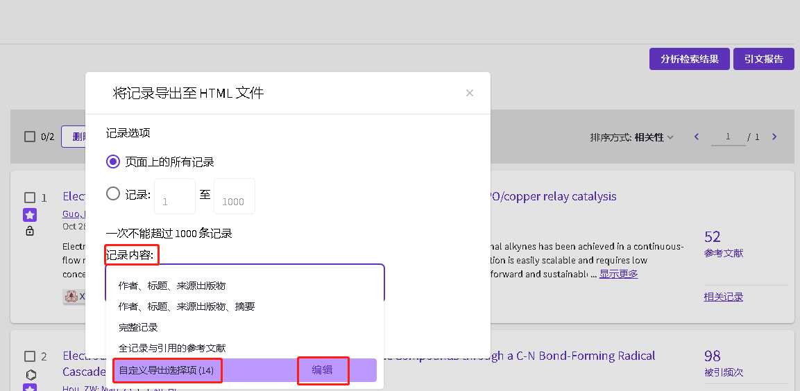 Step 5: After adding all target records to the marked result list, click "Marked result list" to enter the output record list, click "Export", select "Printable HTML file" in the drop-down box, and select " Customize Export Selections", click "Edit" on the right.