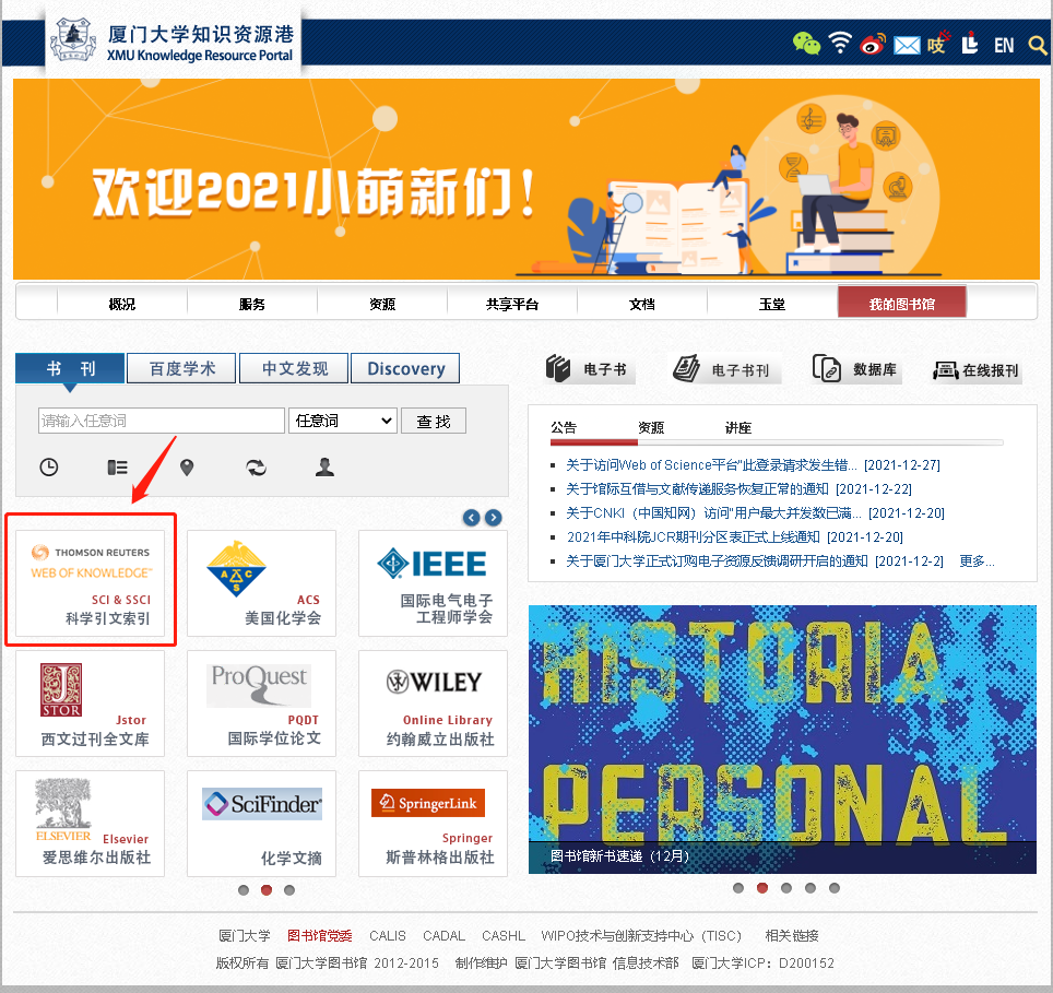 Step 1: Go to the homepage of Xiamen University Library https://library.xmu.edu.cn, with the nine-square grid at the bottom left, switch to the second page, and click the "Science Citation Index" link to enter the database.