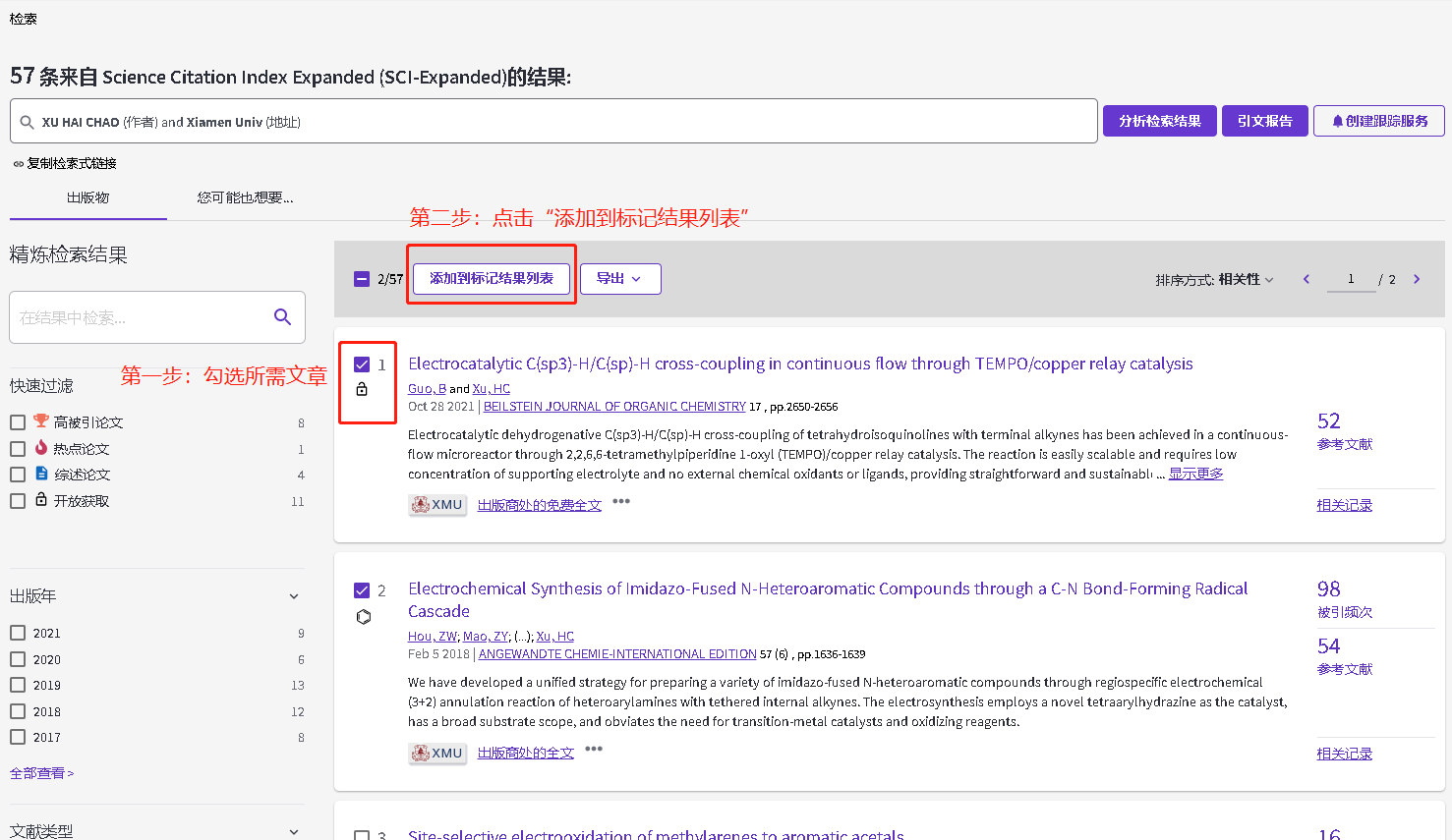 步骤4:在检索到的记录中,勾选目标记录,点击“添加到标记结果列表”按钮,将所选记录添加到“标记结果列表”,若一次无法将所有文章检索到,可重新点击页面左上方的“检索”链接,重复步骤3和4。