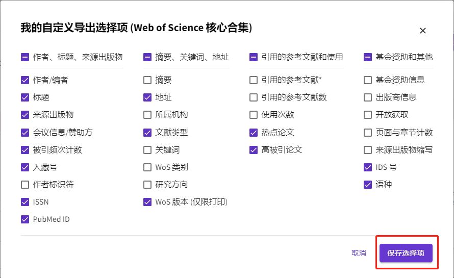 步骤6:在字段中选择如下图所示的15项内容,点击“保存选择项”,然后点击“导出”,出来的页面直接按右上角打印。