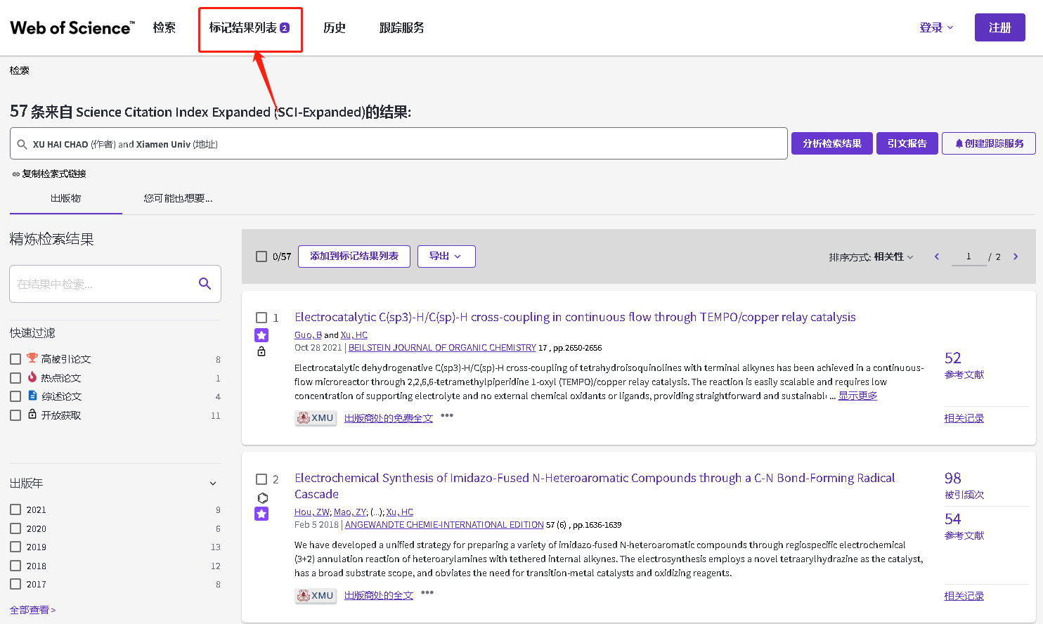 Step 4: In the retrieved records, select the target record, click the "Add to Marked Result List" button, and add the selected record to the "Marked Result List". If all articles cannot be retrieved at one time, you can click the page again. For the “Search” link on the top left, repeat steps 3 and 4.