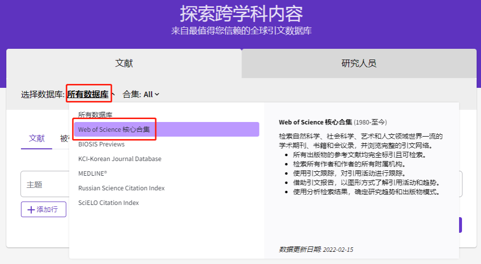 步骤2: 进入WoS平台界面选择数据库,确保选择“Web of Science核心合集”。