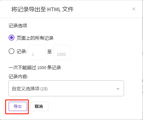 步骤5:将全部目标记录添加到标记结果列表后,点击“标记结果列表”,进入输出记录列表,点击“导出”,在下拉框中选择“可打印的HTML文件”,在记录内容里选择“自定义导出选择项”,点击右侧“编辑”。