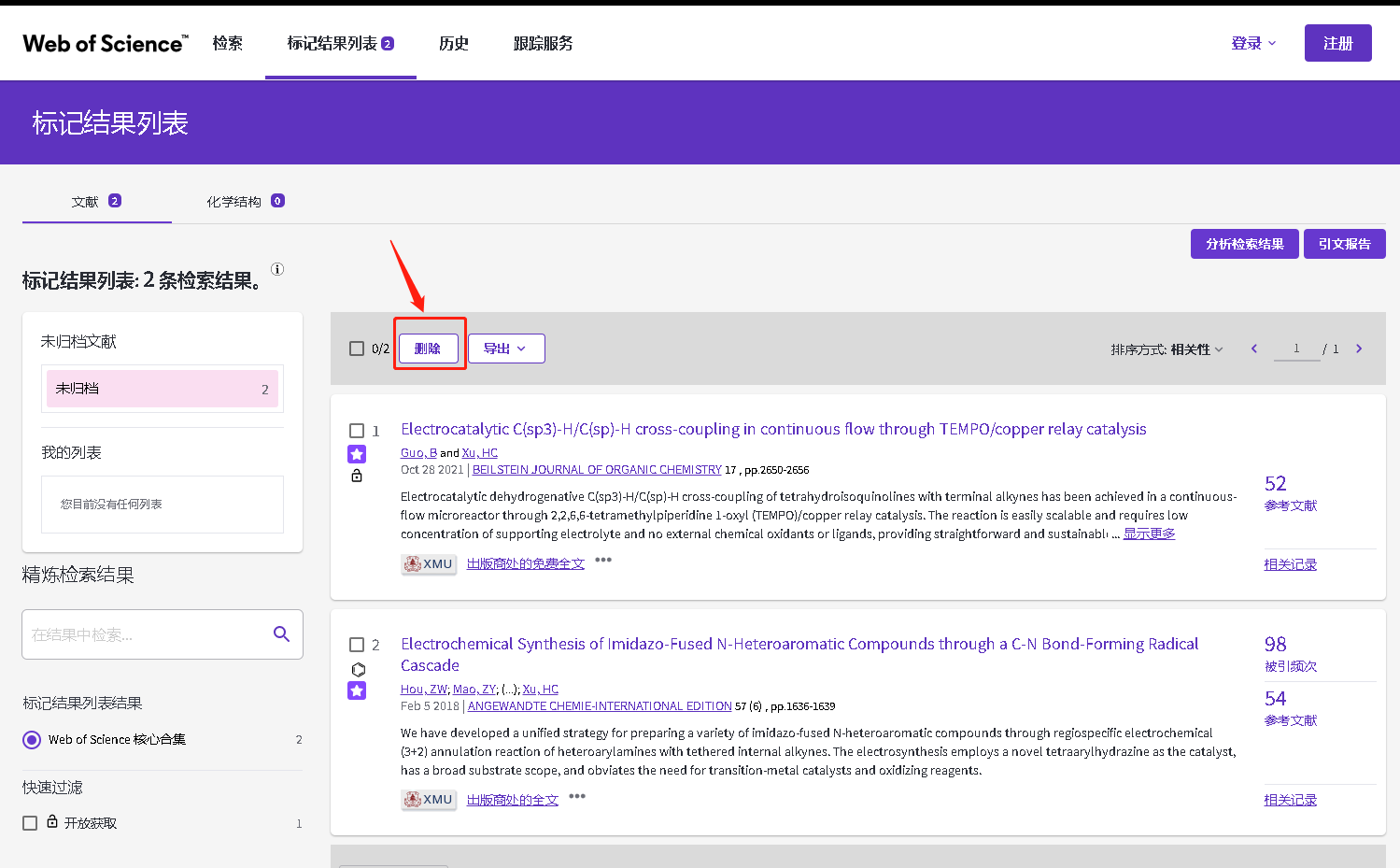 步骤7:若还需继续出具SSCI、CPCI-S或CPCI-SSH的收录证明,则需重新进入标记结果列表,点击“删除”按钮,清空标记结果后,再选择相应的子数据库,重复步骤2-6。