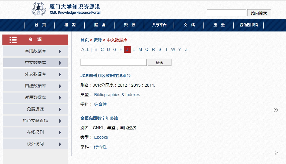 步骤1:进入厦门大学图书馆主页,点击“资源”---“中文数据库”---字母“J”---“JCR期刊分区数据在线平台”。