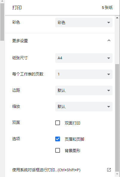 步骤6:打印设置:在浏览器的打印设置中勾选“页眉和页脚”选项。结果将显示数据来源。