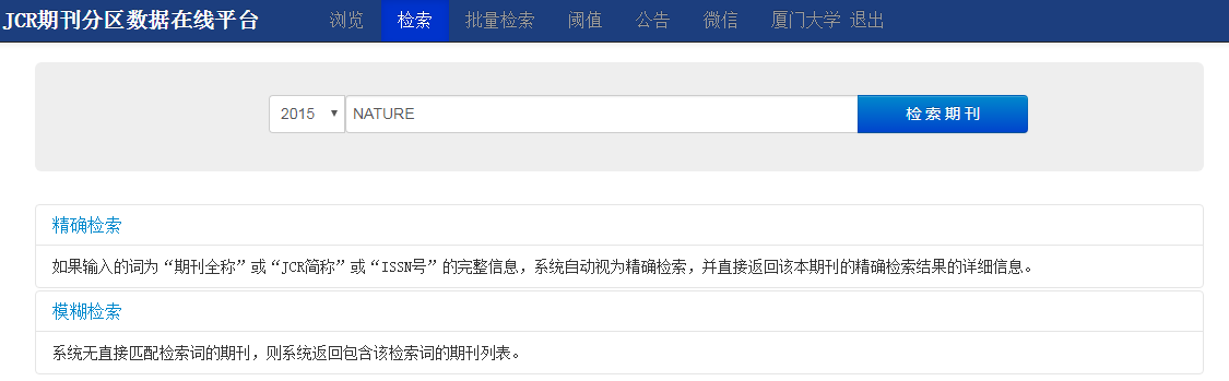 步骤3:进入数据库后,如果检索单本期刊,选择“检索”;如果检索多本期刊,选择“批量检索”。