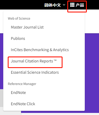 (2)Click the “product” in the upper right corner of the page, select "Journal Citation Reports" from the drop-down box, and enter the JCR search page.