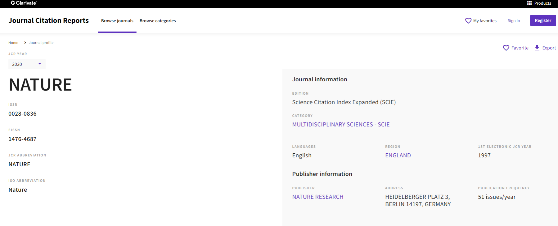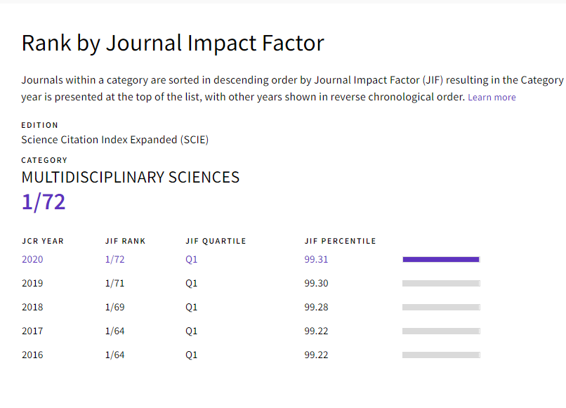 (5)Pull down the page until you see "Rank by Journal Impact Factor" to view the journal's zoning. The following are the different annual divisions of NATURE. For specific divisions, see the JIF Quartile field.