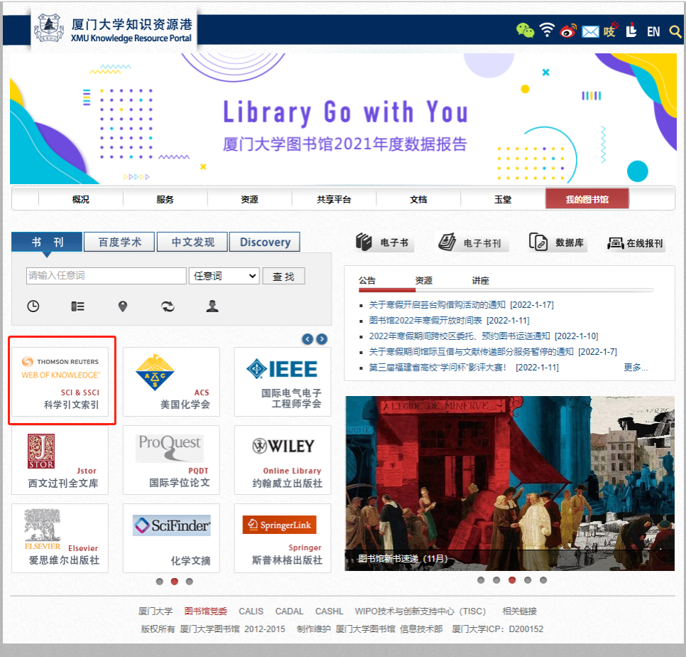 (1)Go to the homepage of Xiamen University Library https://library.xmu.edu.cn, with the nine-square grid at the bottom left, switch to the second page, and click the "Science Citation Index" link to enter the database.