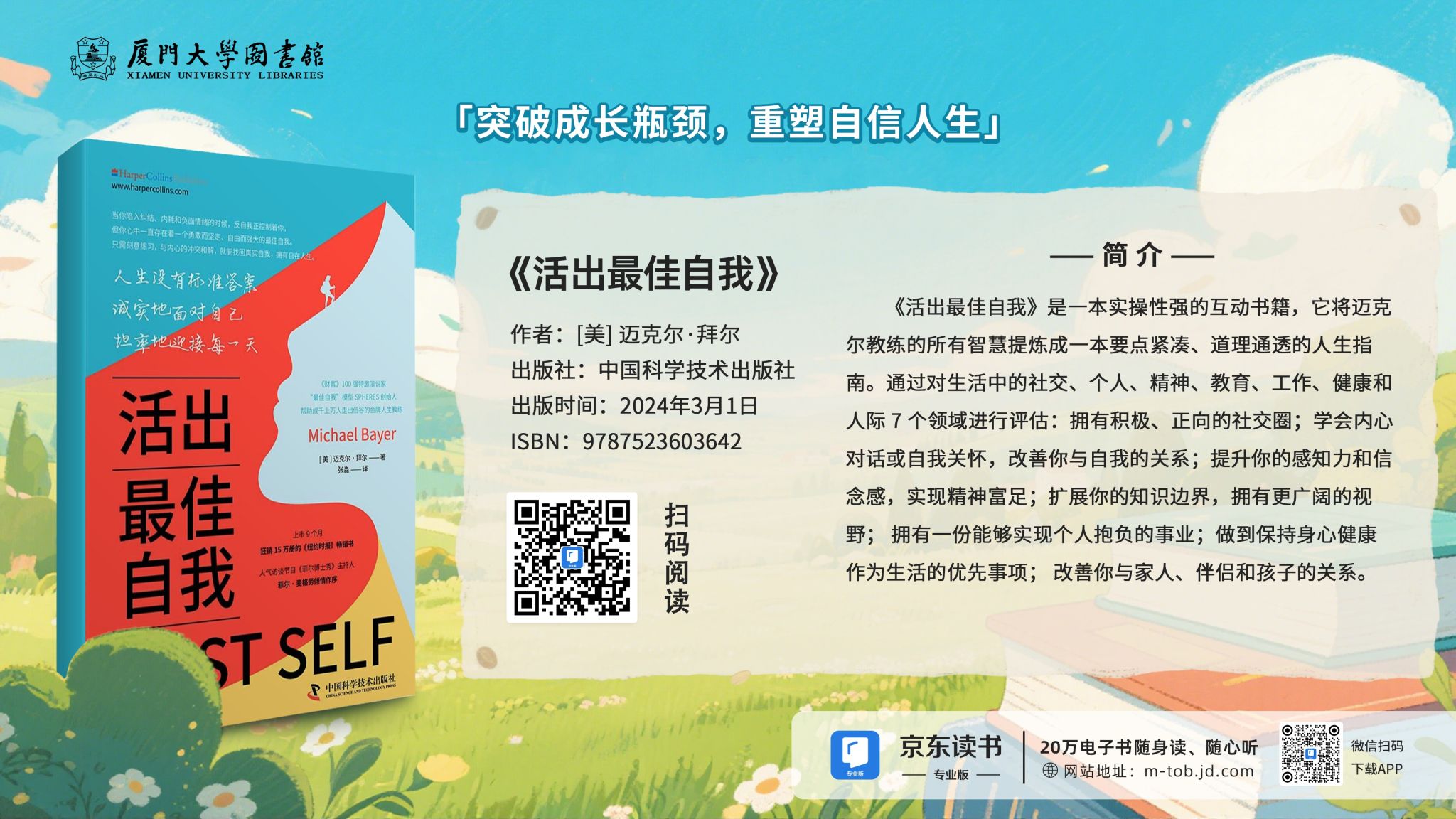 图书馆为你精选了几本心理成长、哲学思辨、文学探索、历史漫游、科幻畅想的佳作,无论你想成为更好的自己,还是希望与智者们跨越时空对话,这些电子图书都将拓宽你的视野。