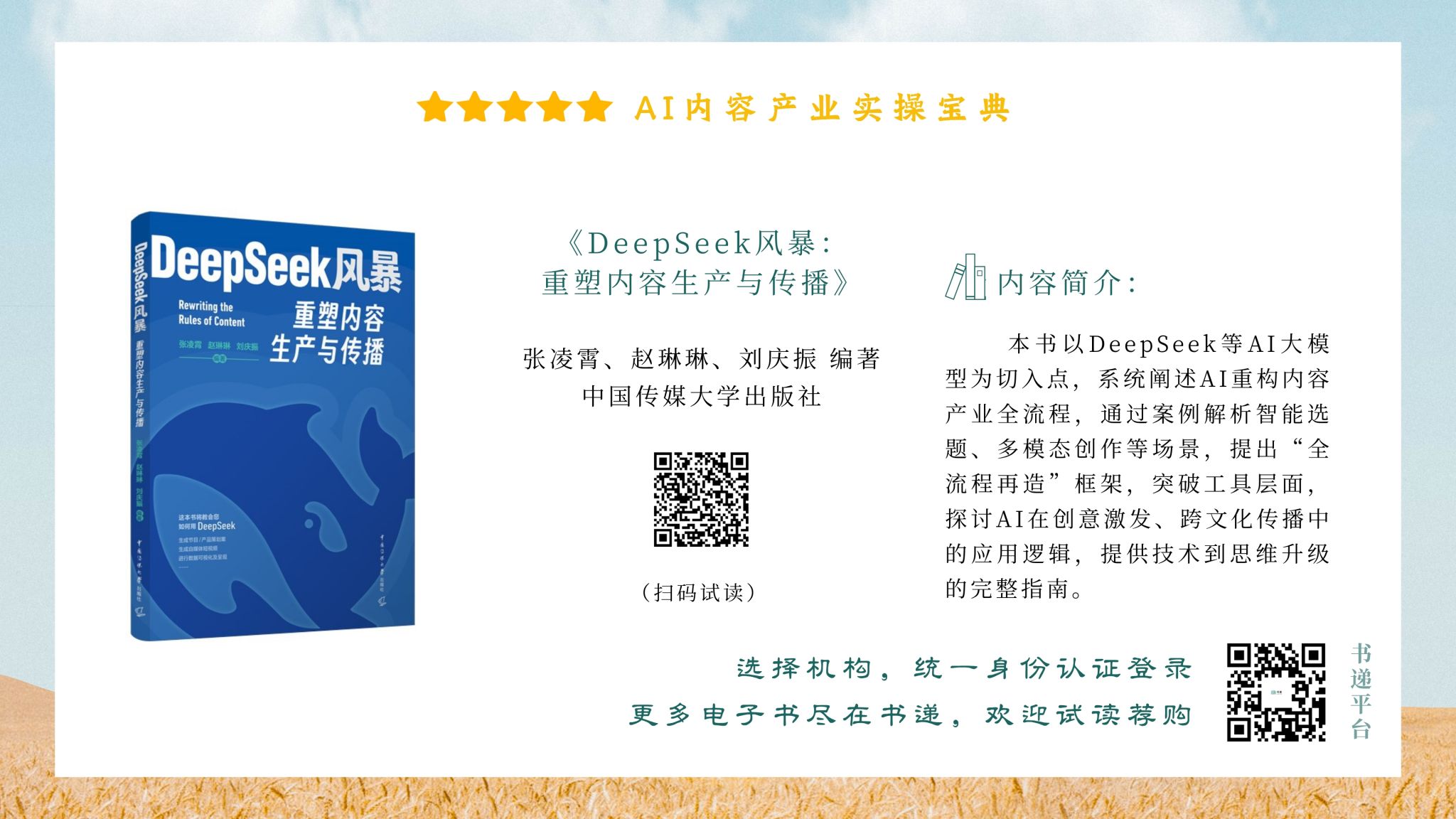 本书以DeepSeek等AI大模型为切入点,系统阐述AI重构内容产业全流程,通过案例解析智能选题、多模态创作等场景,提出“全流程再造”框架,突破工具层面,探讨AI在创意激发、跨文化传播中的应用逻辑,提供技术到思维升级的完整指南。