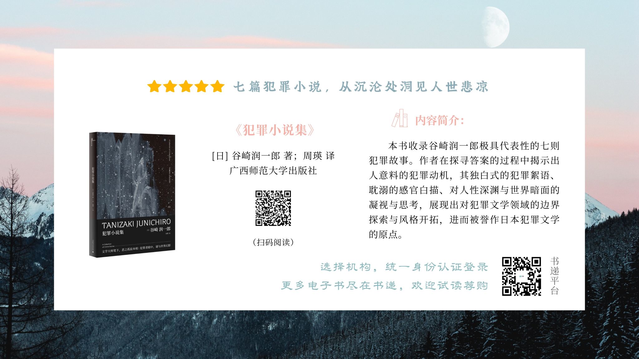 本书收录谷崎润一郎极具代表性的七则犯罪故事。作者在探寻答案的过程中揭示出人意料的犯罪动机,其独白式的犯罪絮语、耽溺的感官白描、对人性深渊与世界暗面的凝视与思考,展现出对犯罪文学领域的边界探索与风格开拓,被誉为日本犯罪文学的原点。