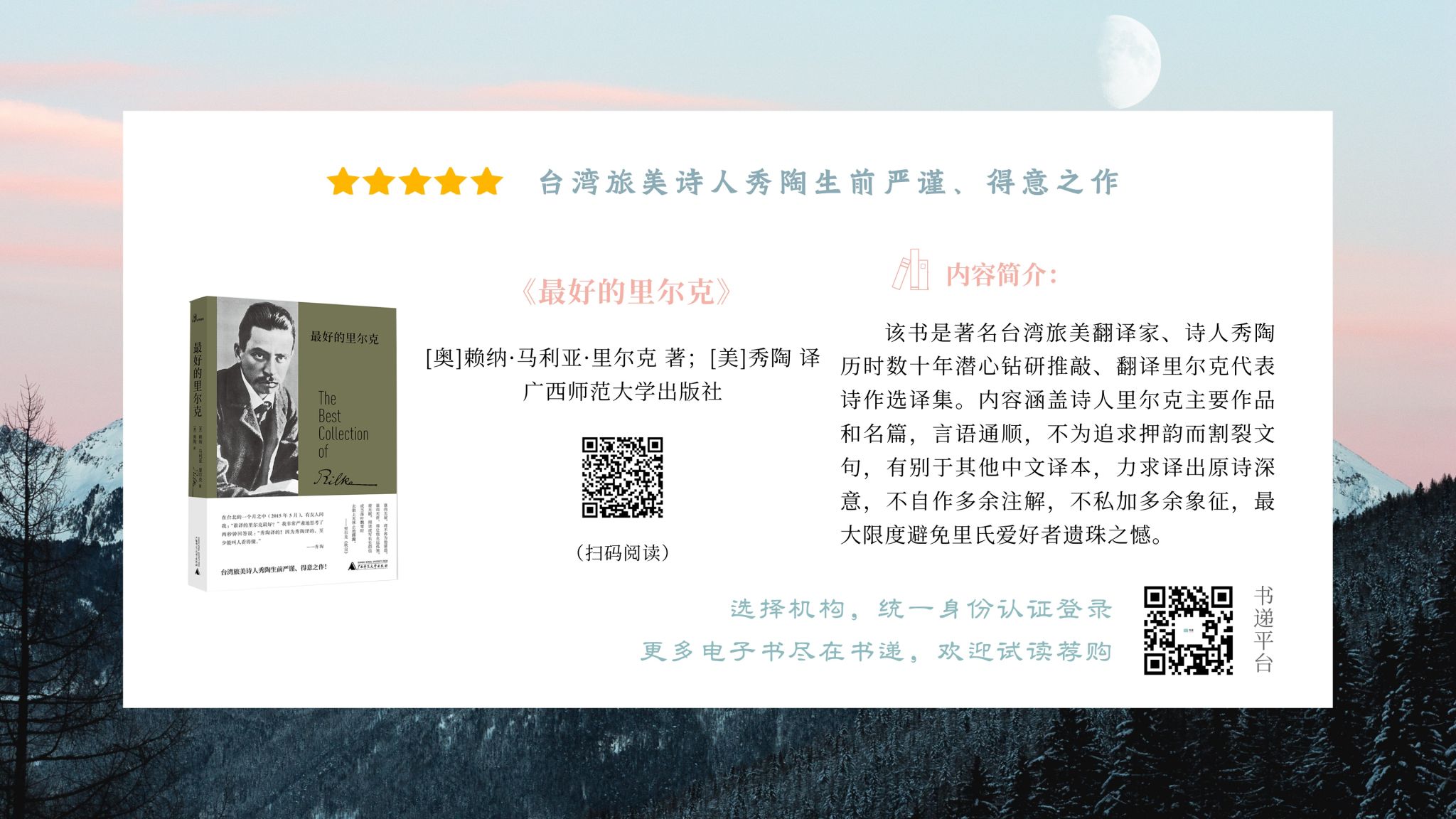 该书是著名台湾旅美翻译家、诗人秀陶历时数十年潜心钻研推敲、翻译里尔克代表诗作选译集。内容涵盖诗人里尔克主要作品和名篇,言语通顺,不为追求押韵而割裂文句,有别于其他中文译本,力求译出原诗深意,不自作多余注解,不私加多余象征,最大限度避免里氏爱好者遗珠之憾。