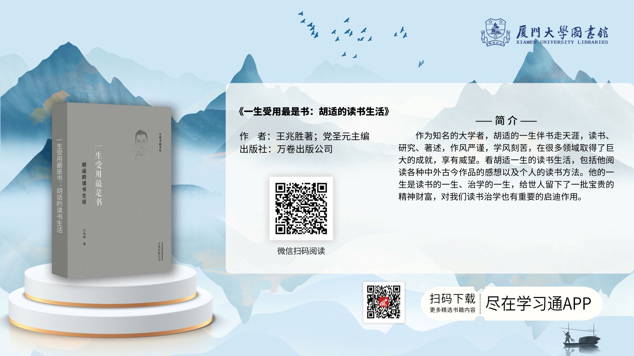 作为知名的大学者,胡适的一生伴书走天涯,读书、研究、著述,作风严谨,学风刻苦,在很多领域取得了巨大的成就,享有威望。看胡适一生的读书生活,包括他阅读古今中外各种作品的感想以及个人的读书方法。他的一生是读书的一生、治学的一生,给世人留下了一批宝贵的精神财富,对我们读书治学也有重要的启迪作用。