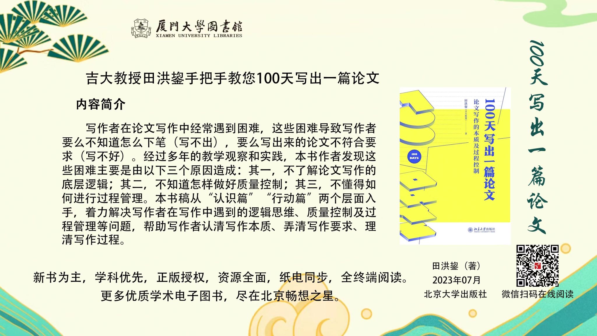 论文写作对同学们来说,既是挑战,也是学术精进的契机。除了以上两期推送之外,本期我们为大家精心挑选了一批“畅想之星”提供的电子图书,引导大家深入理解论文写作的本质,探索其背后的逻辑,掌握质量控制的艺术,学会高效的过程管理,帮助大家在大约100天内,实现从写作的自我认知,到自我管理,再到自我改进的全方位提升!