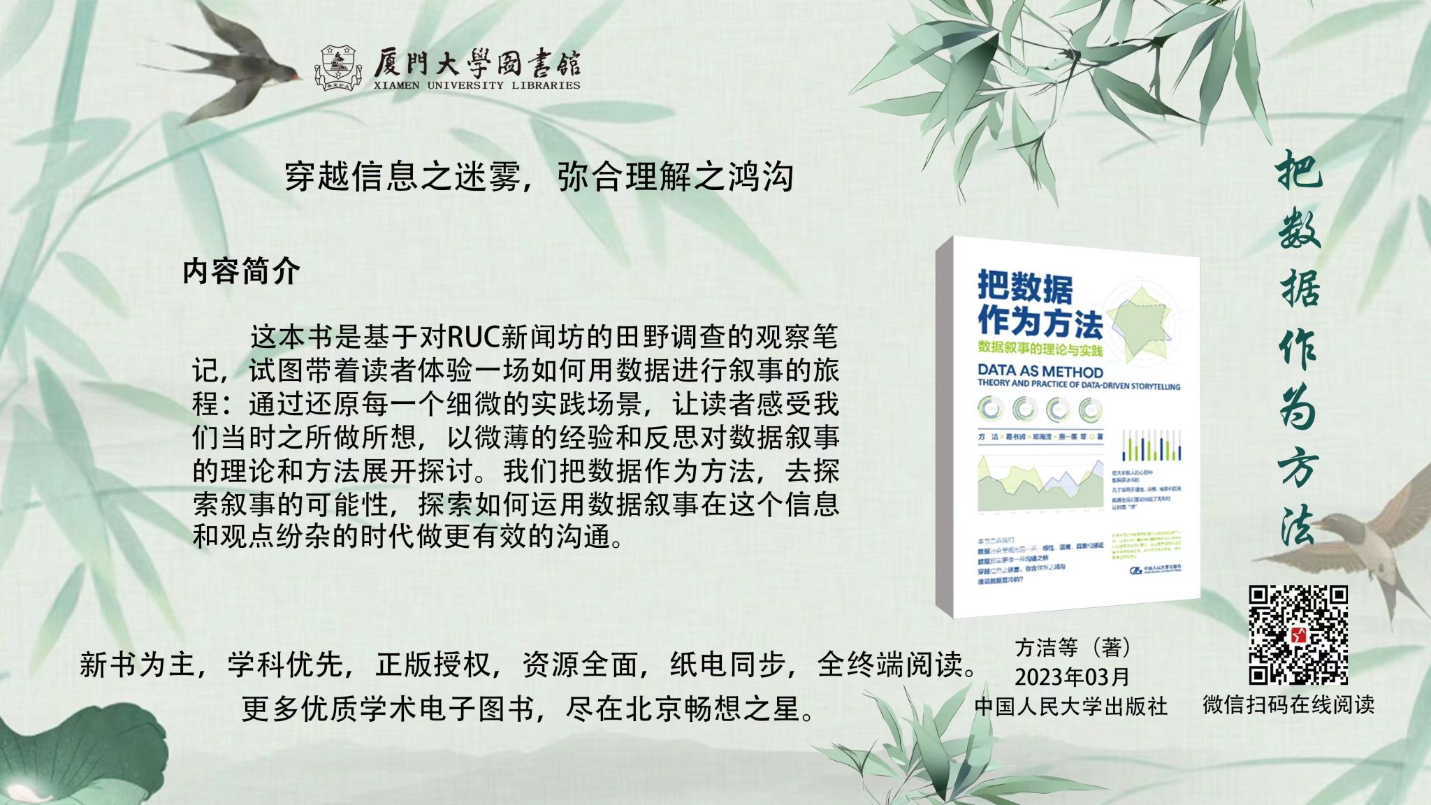 图书简介:这本书是基于对RUC新闻坊的田野调查的观察笔记,试图带着读者体验一场如何用数据进行叙事的旅程:通过还原每一个细微的实践场景,让读者感受我们当时之所做所想,以微薄的经验和反思对数据叙事的理论和方法展开探讨。我们把数据作为方法,去探索叙事的可能性,探索如何运用数据叙事在这个信息和观点纷杂的时代做更有效的沟通。