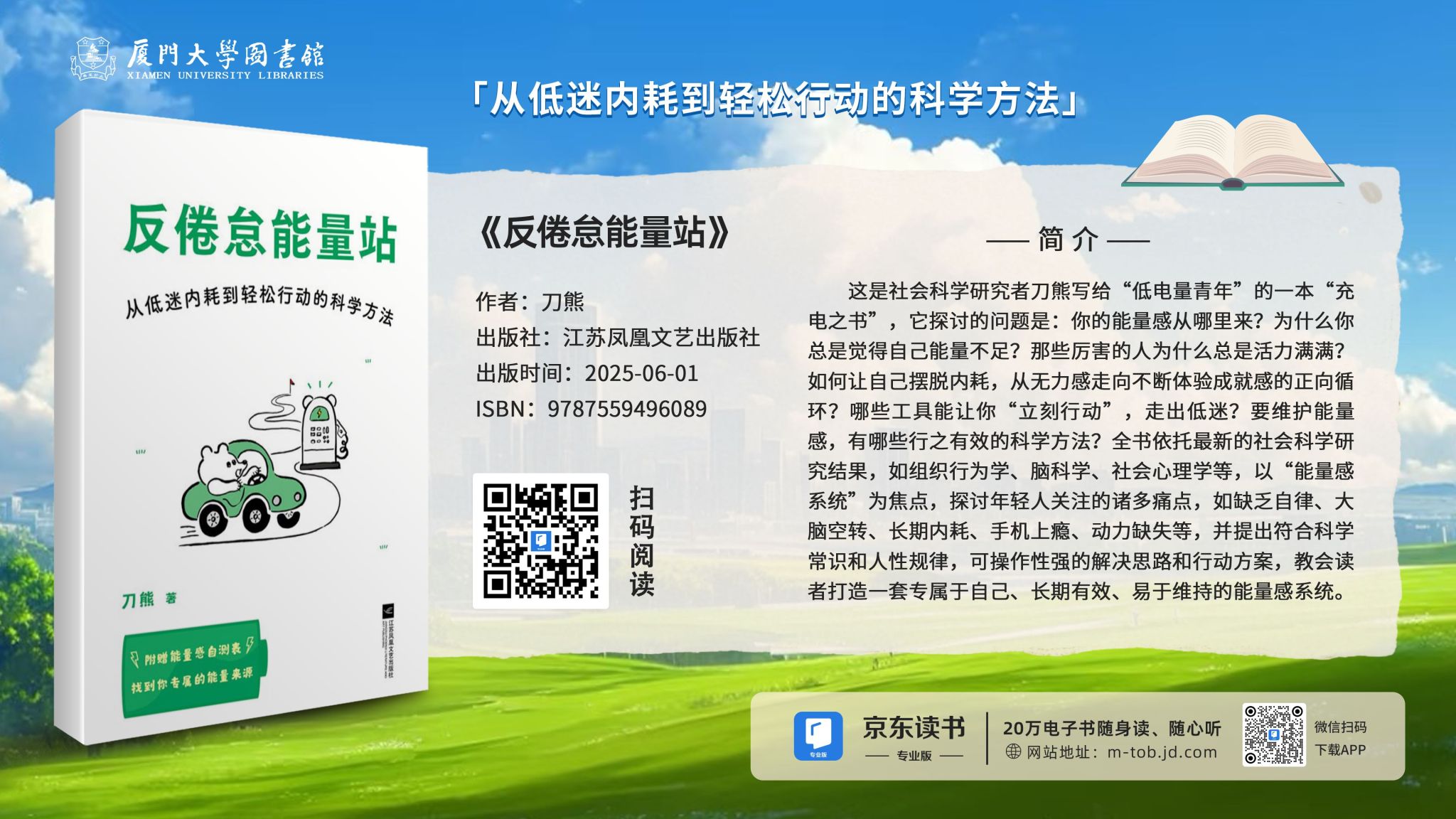 书籍简介:这是社会科学研究者刀熊写给“低电量青年”的一本“充电之书”。全书依托最新的社会科学研究结果,如组织行为学、脑科学、社会心理学等,以“能量感系统”为焦点,探讨年轻人关注的诸多痛点,如缺乏自律、大脑空转、长期内耗、手机上瘾、动力缺失等。