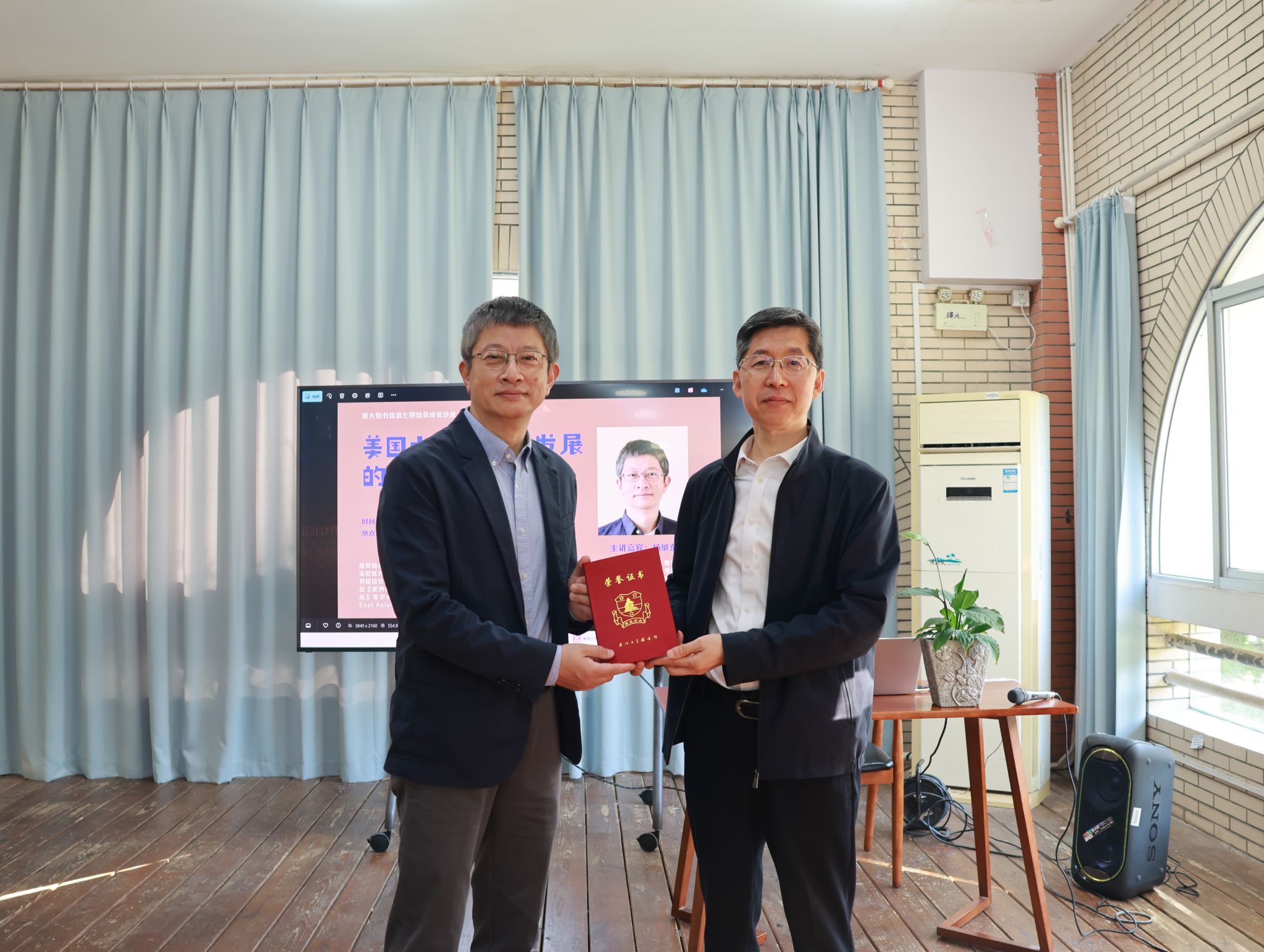2025年11月21日上午,厦门大学图书馆第七期“馆员成长沙龙”在总馆二楼凤凰花咖啡屋成功举办。本期沙龙特邀哈佛大学哈佛燕京图书馆馆长杨继东博士,以“美国大学图书馆发展的最新趋势——几点个人的观察”为题,分享了他多年在美国多家顶尖大学图书馆工作的实践洞察与前瞻思考。沙龙由图书馆馆长钞晓鸿教授主持。沙龙伊始,钞晓鸿向杨继东颁发馆员成长沙龙授课证书。