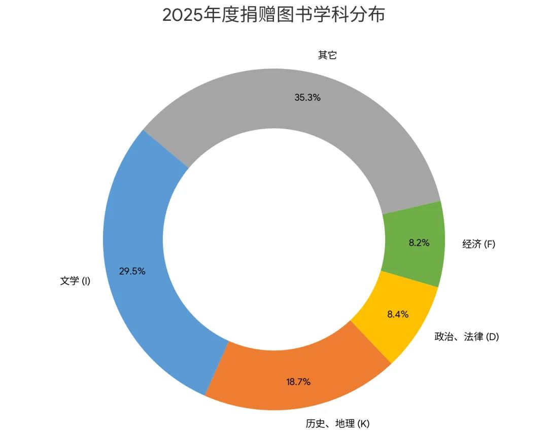 2025年,图书馆收到了来自本校师生、校友及社会各界的慷慨馈赠——共接收赠书16,671种18,998册。其中12,067册为首次入藏,有效填补了相关学科与专题领域的馆藏空白。