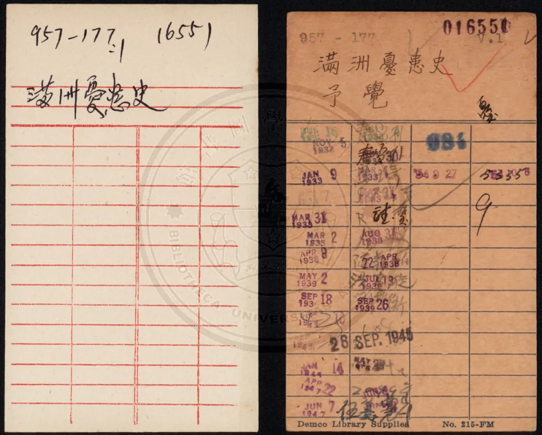 厦大图书馆藏本为1929年中文初版本。1931年“九·一八事变”以后,东北时局成为中国民众深切关注的民族危亡问题,伴随而来的是东北史地的深入学习与研究。在《满洲忧患史》的书袋卡上,首条借阅记录为1932年6月16日,按照当时的图书编目流通速度,此书应是1932年上半年采购入馆。首位借阅者即图书馆职员秦贤行,且于11月5日又续借过一次,可见他认真通读过此书。这不禁让人联想——这段阅读经历与他次年2月北上抗日是否存在直接关系?今人阅读原著后去感悟吧!