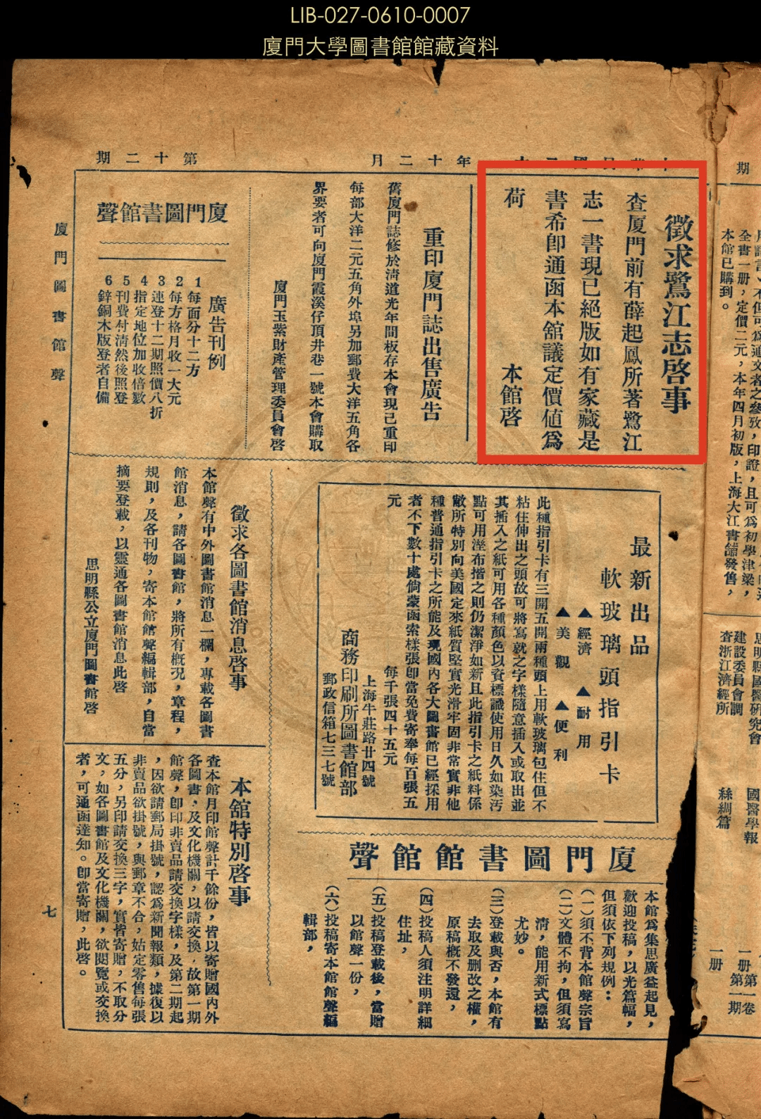 1930年,厦大1929届毕业生薛澄清在《江声报》发表《厦大图书馆搜得〈漳州府志〉经过述略》,其中特别提到:“闽南各县县志有的到了现在几乎无法搜得。今年夏,我本人曾花了五块钱的广告费,在厦门思明报刊登《征求〈鹭江志〉启事》一则,可是过了一月之久,一点消息也没有,使我很失望。”所说《鹭江志》即清乾隆时期厦门人薛起凤所修,在当时已经甚为罕见,以致搜求而不得。