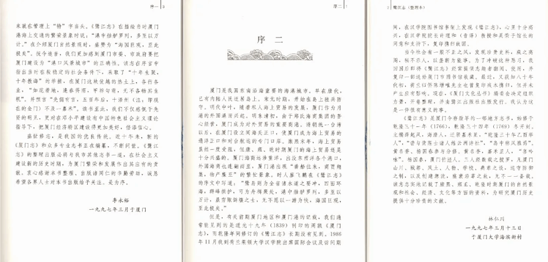 ▲乾隆《鹭江志》整理本封面、李永裕序、林仁川序,鹭江出版社1998年初版、2020年再版