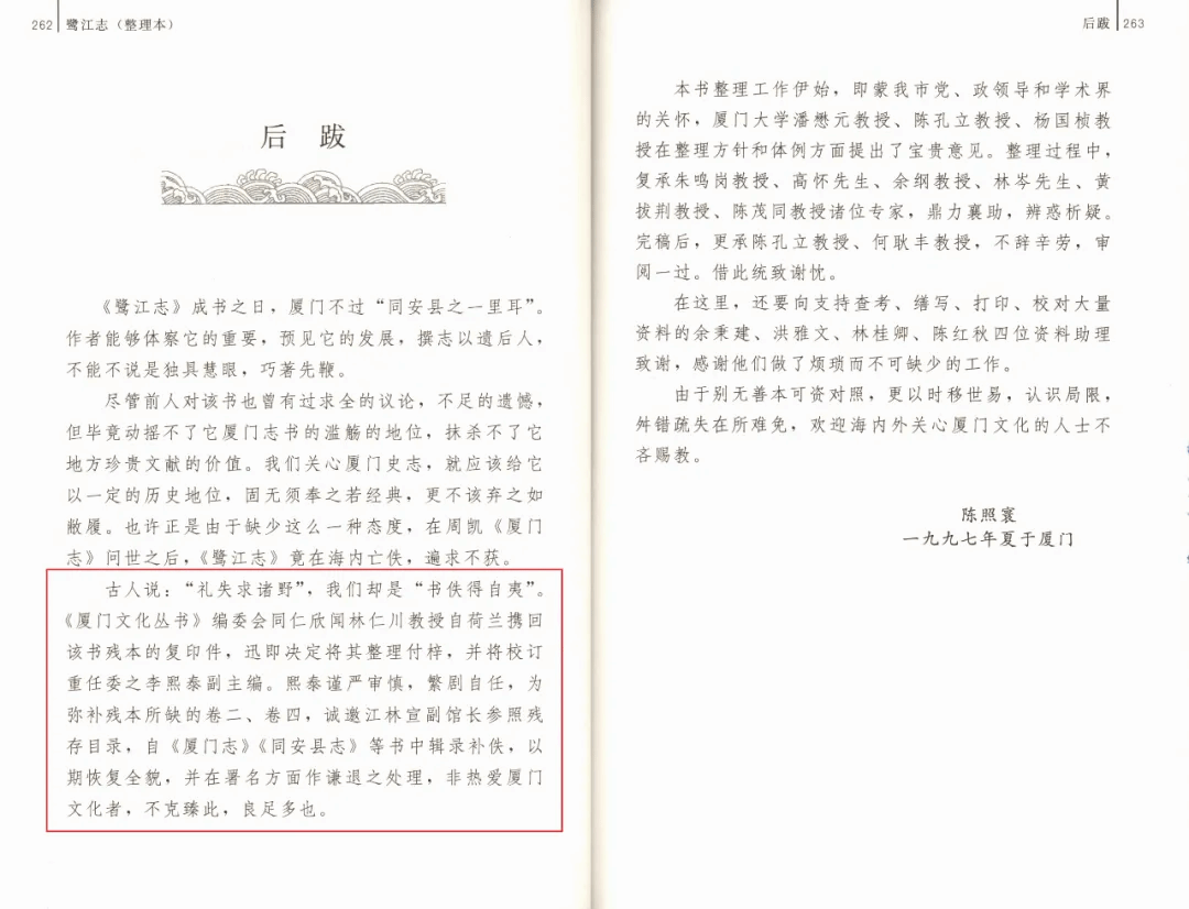 ▲乾隆《鹭江志》整理本陈照寰后跋,2020年再版