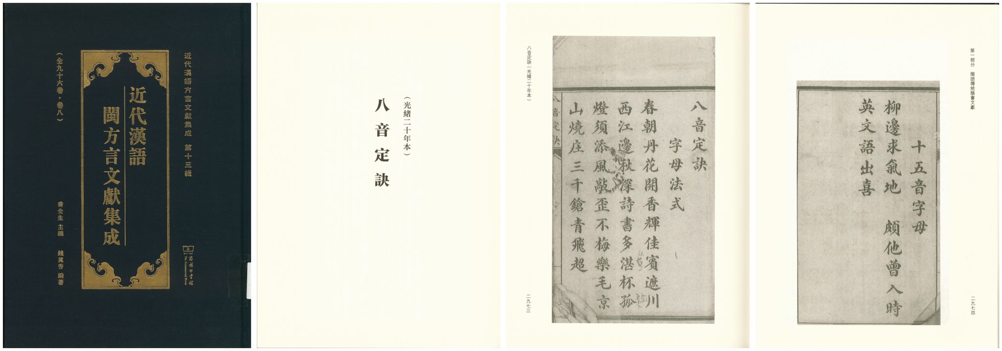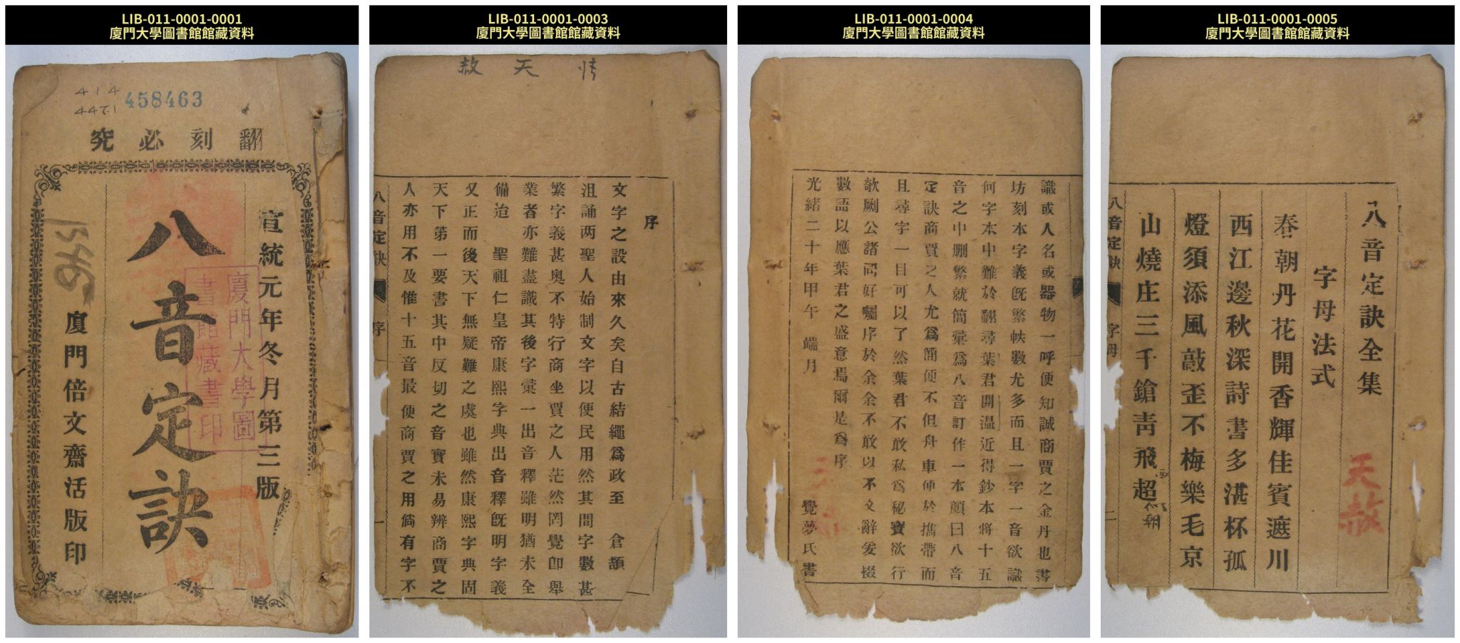 厦大图书馆收藏着1册名为《八音定诀》(又名《八音定诀全集》)的韵书,叶开温编著,觉梦氏作序,清宣统元年(1909)厦门倍文斋铅印本。叶开温、觉梦氏是何许人士?目前尚不知晓。此书序言亦未明言是何地方言。据厦大中文系钱奠香副教授统计,“该书版本较多,主要版本有1875、1904、1909年厦门信〔倍〕文斋活字版,光绪二十年(1894年)甲午端月木刻版,光绪二十二年(1896年)厦门会文堂版,1904年福州福灵堂刊版,1924年厦门会文书局石印本,1940年厦门会文堂石印本。”现在较为通行的早期版本有3种:清光绪二十年刻本的手抄本,清宣统元年厦门倍文斋铅印本,1924年厦门会文书局石印本。