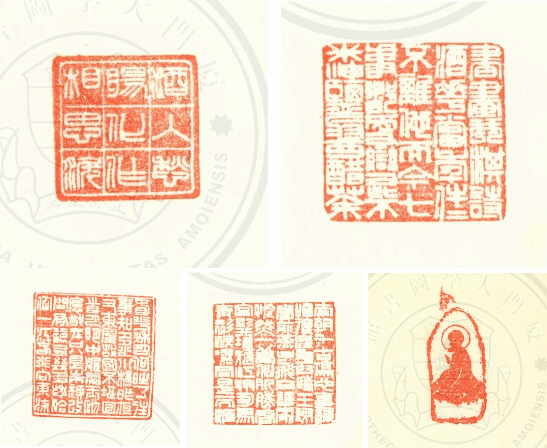 《厦大周刊》1934年第331期登载一则“校闻”——《厦大中国艺术社图章展览会志盛》,详细讲述了1934年元旦举办“图章展览会”的盛况。该展览会在生物楼三楼校长会客厅举办,展品分四类:一是古代图章,二是近代名人所刻图章,三是社员作品,四是印谱,共计图章200余方,印谱20余部。厦大图书馆藏《印谱》则是此次图章展览会的部分图章印文汇编。