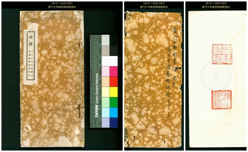 ▲厦门大学图书馆藏《印谱》封面、封里和首叶