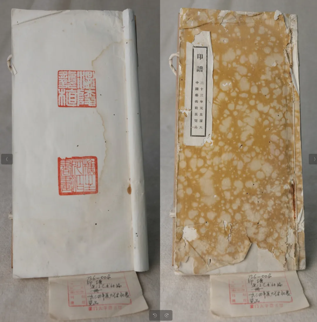 厦大图书馆藏有一册线装《印谱》,封面题名小注“二十三年元旦厦大中国艺术社展览品”,封里题写“厦门大学图书馆惠存,厦大中国艺术社赠,二十三·一·十五”。由此可知,这册《印谱》是1934年厦大中国艺术社赠予厦大图书馆。该书没有序言或题跋等其他信息。追根溯源,我们要从厦大中国艺术社及其举办的一次展览会说起。