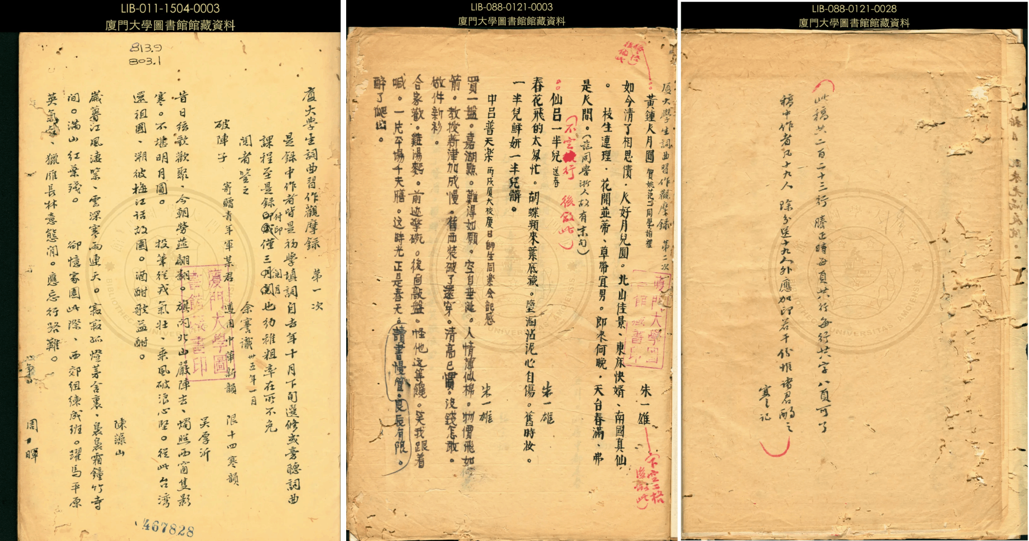 ▲从左至右,分别为:《厦大学生词曲习作观摩录(第一次)》卷首、《厦大学生词曲习作观摩录(第二次)》卷首、《厦大学生词曲习作观摩录(第二次)》卷末