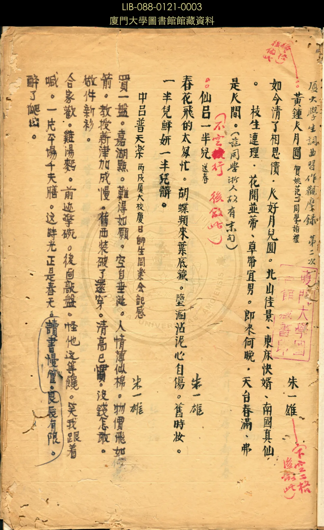 学之大者,奖掖后学。从“观摩”二字便可洞悉余謇编辑此书的意图——切磋学问、培植人才。该书虽为学生习作集,但词曲主题具有鲜明的时代特征,立意深刻,又经名家指导、批阅和选编,其文化教育和学术价值不容低估。这24位学生并非都来自“中国文学系”,但对中国古典学问的研习别无二致,其中不少人后来在学术上成名成家,如朱一雄(美籍华裔教授)在绘画艺术领域颇有建树。更为重要者,该书可以具体呈现当时厦大名师的教学水平和学生的优良学风,对厦大精神的传承具有特殊意义。