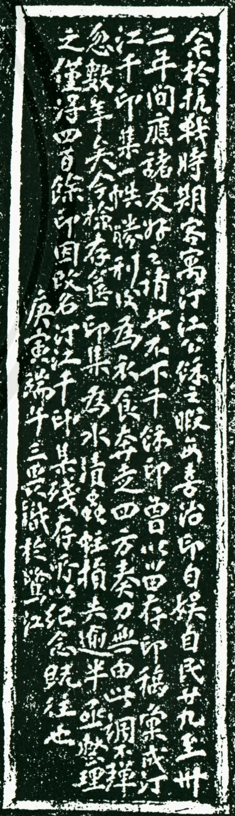 ▲《了斋书法篆刻存稿》“汀江千印集残存”边款:“余于抗战时期客寓汀江,公余之暇每喜治印自娱。自民廿九年至卅二年间,应诸友好之请者不下千余印,曾以留存印稿汇成《汀江千印集》一帙。胜利后为衣食奔走四方,奏刀无由,此调不弹,忽数年矣。今检存箧印集为水渍虫蛀,损失逾半,亟整理之,仅得四百余印,因改名《汀江千印集残存》,所以纪念既往也。庚寅端午,三畏识于鹭江。”