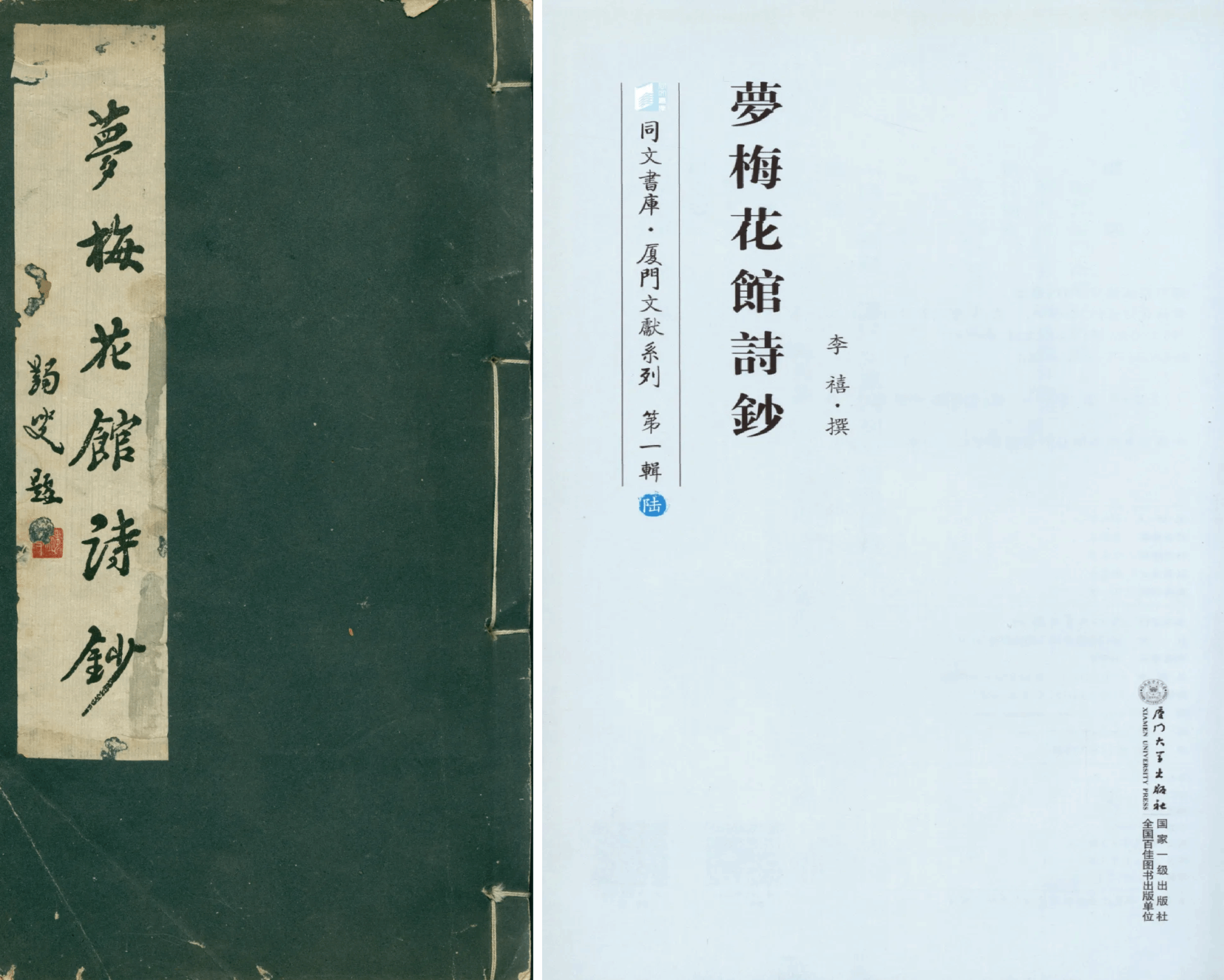 ▲左:厦门大学图书馆藏李禧《梦梅花馆诗钞》右:《同文书库·厦门文献系列》第一辑收录李禧《梦梅花馆诗钞》,厦门大学出版社,2016年