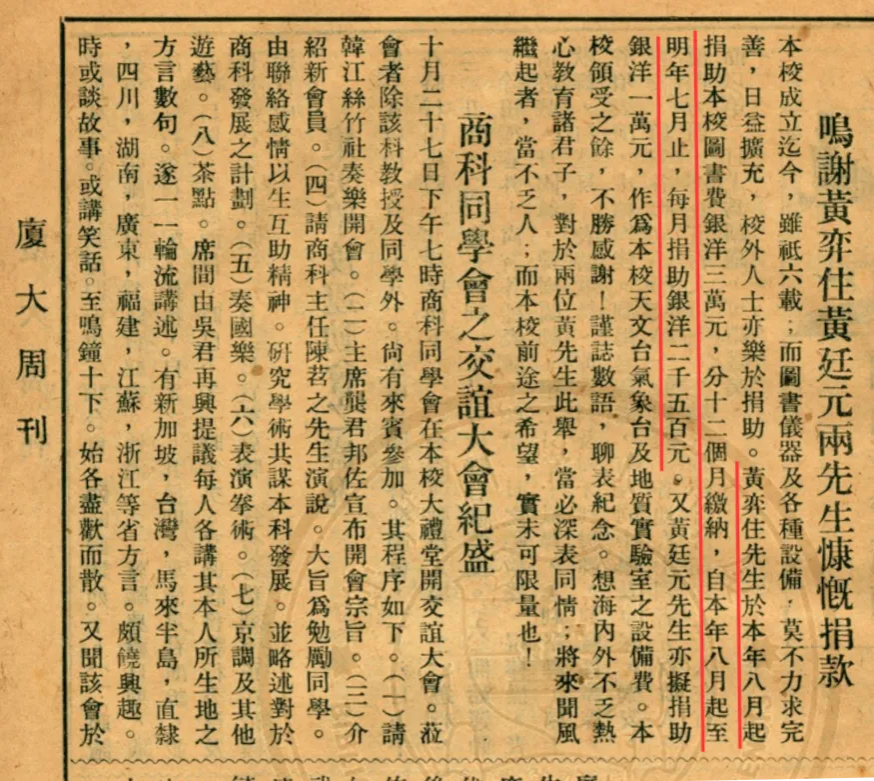 ▲《厦大周刊》1927年第171期记载黄奕住捐款信息