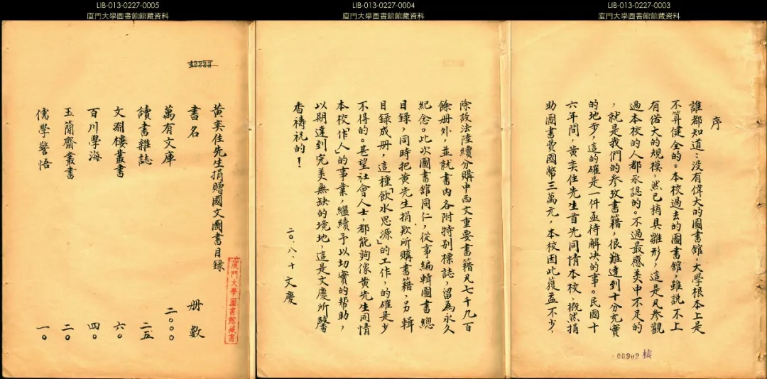 ▲《黄奕住先生捐赠图书目录》之“国文图书目录”和林文庆“序”
