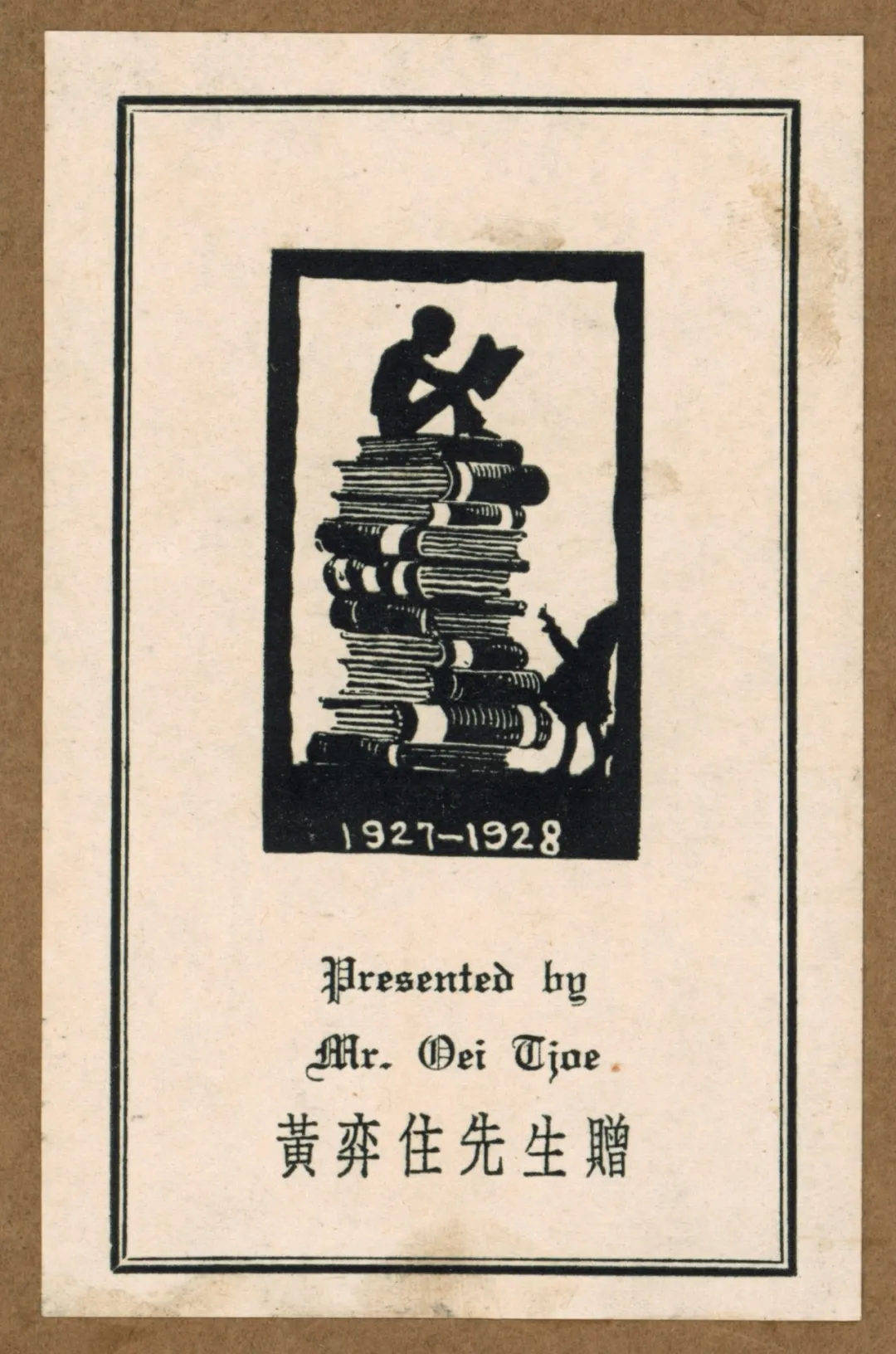 一是特制藏书票。上书“黄弈住先生赠”和“Presented by Mr Oei Tjoe”,粘贴在捐购图书的护叶上,作为“特别标志,留为永久纪念”。