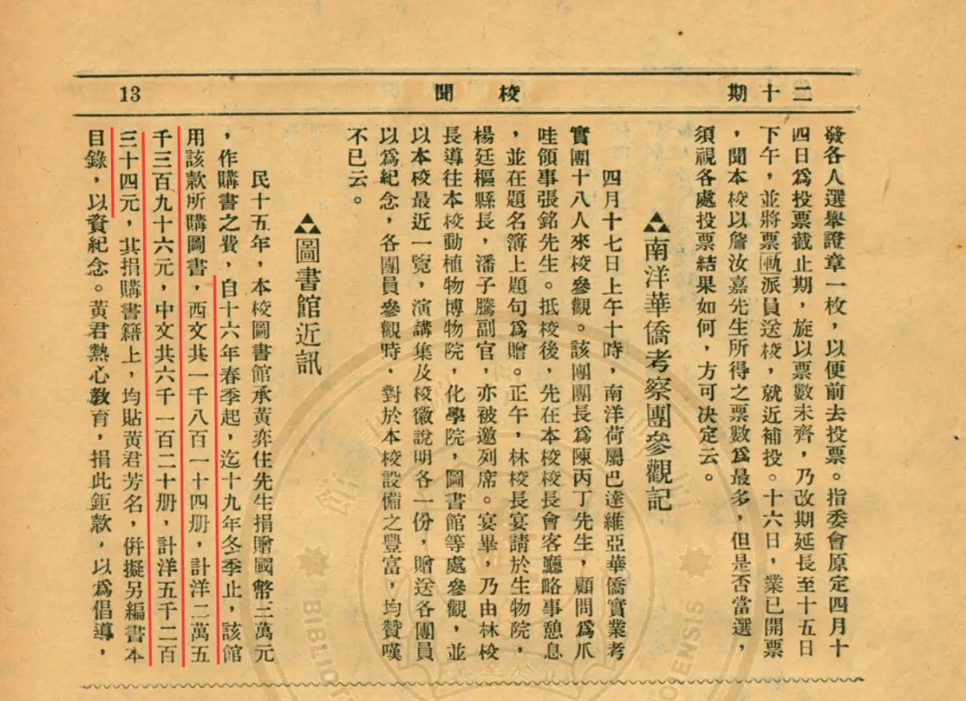 ▲《厦大周刊》1931年第256期记载黄奕住捐款购书信息
