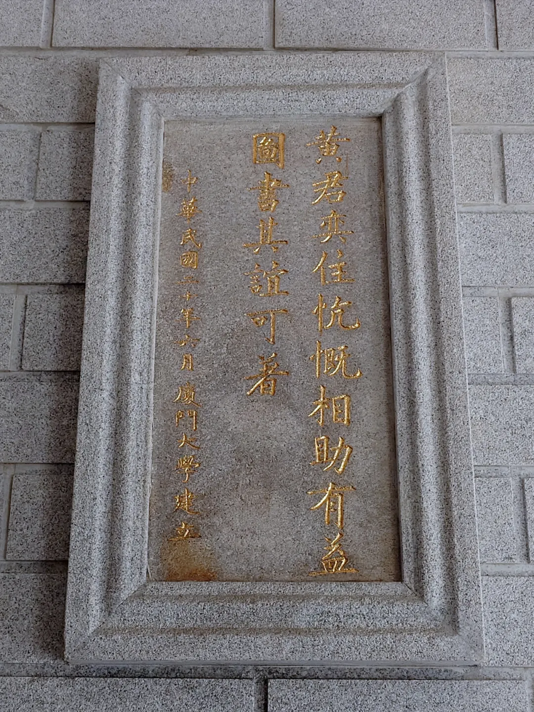 三是刻碑纪功。特请文学院教授毛常撰文并书丹——“黄君奕住,忼慨相助。有益图书,其谊可著”,1931年6月在群贤楼下勒石立碑,正是镶嵌在群贤主楼廊厅侧壁的这块石碑。