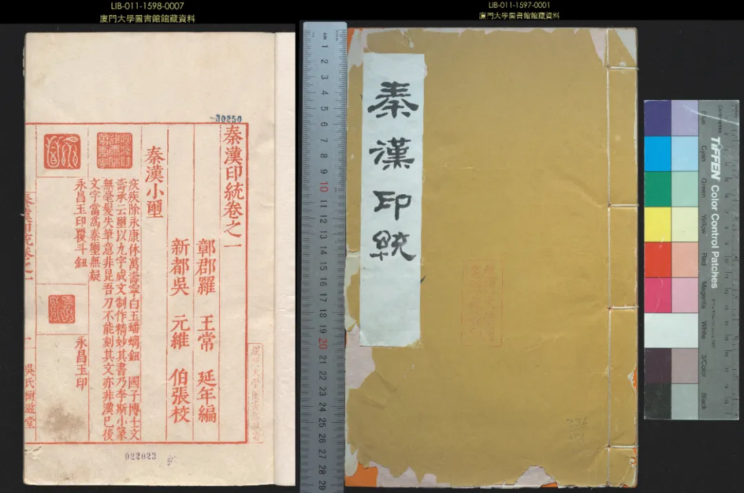 ▲厦大图书馆藏《秦汉印统》“封面”和“卷一”首叶