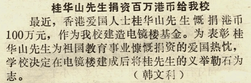 《厦门大学》校报1983年第113期刊登一则简讯——《桂华山先生捐资百万港币给我校》,报道香港爱国人士桂华山捐助100万元港币兴建“电镜楼”。