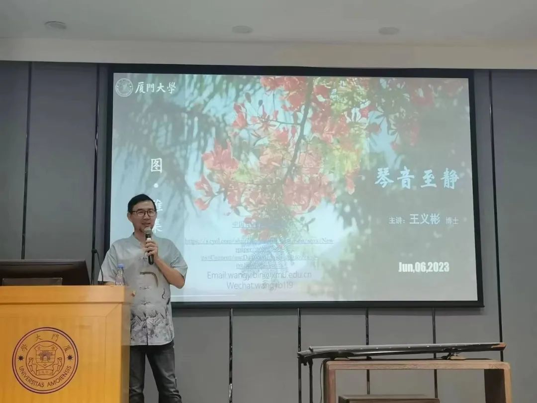 芒种时节(6月6日),在 图书馆南强报告厅, 厦门大学美育课程“古琴演奏与美学”师生举办“圕·琴雅集”。 艺术学院王义彬老师作为主讲老师,给大家带来了一次视觉与听觉的美学享受。