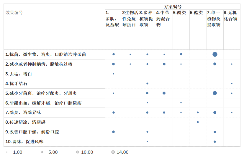 如图2.2.1所示牙膏技术分支-含植物组分配方的技术功效(效果和方案的编号及具体描述详见下表),含植物组分配方的技术方案主要分为单一植物类提取物,中草药混合物、多种植物提取物以及添加有免疫球蛋白、多肽、氨基酸、功能性有机物和无机物等。其中多种技术方案均可达到1、2和7三种效果;技术方案3和9所涉及的效果种类最多。